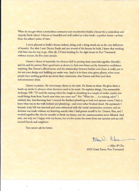 Darren is patient. He never keeps clients in the dark. He listens to them. He gives them a heads-up weeks in advance when decisions need to be made. He explains things. One memorable exchange: DB: "I'll need the mixing valves for rough-in plumbing in a couple of weeks; maybe you could bring them from Seattle next time you come out?" Me: "What the … is a mixing valve?" I realized, fast, that knowing how I wanted the finished plumbing to look and operate meant I had to learn what was in the walls behind said plumbing. He explained, I learned, every bill was itemized and cross-referenced with the initial construction contract, and no decision was made without my knowing exactly what I had gotten myself in for. Darren, Rita, and I worked together like this for months to finish my house, and the communication never faltered. And now, not only am I happy with my house, we live across the street from one another and are still trusted friends and neighbors.